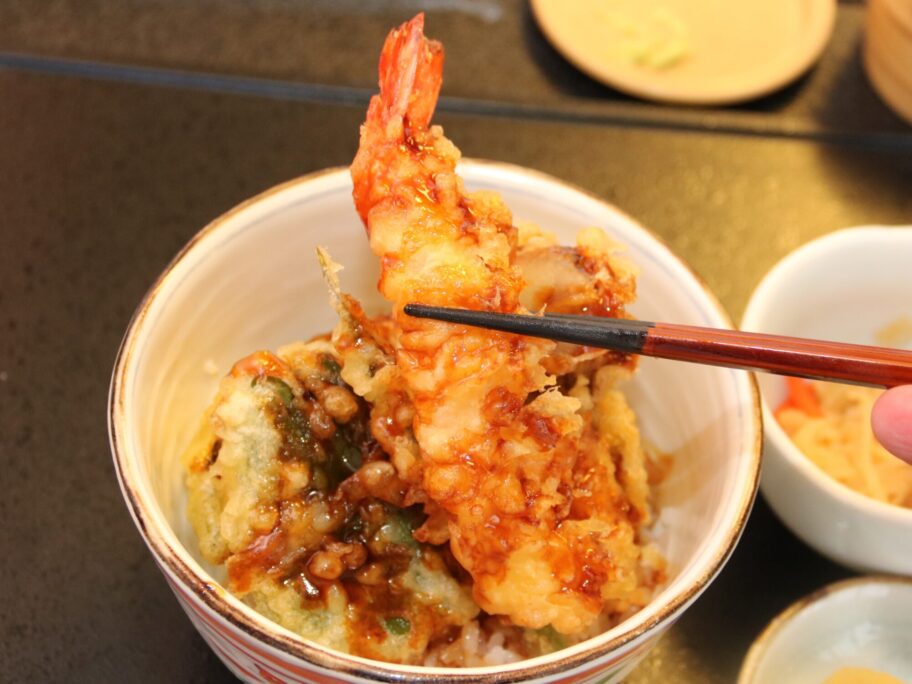 天丼はエビが「主役だ」とばかりにそびえたっています。では、主役から。サクッと軽く揚がっています。タレはやや甘め。ご飯が進みます。厳選した新潟県産米とか。硬めに炊かれているのもうれしい。