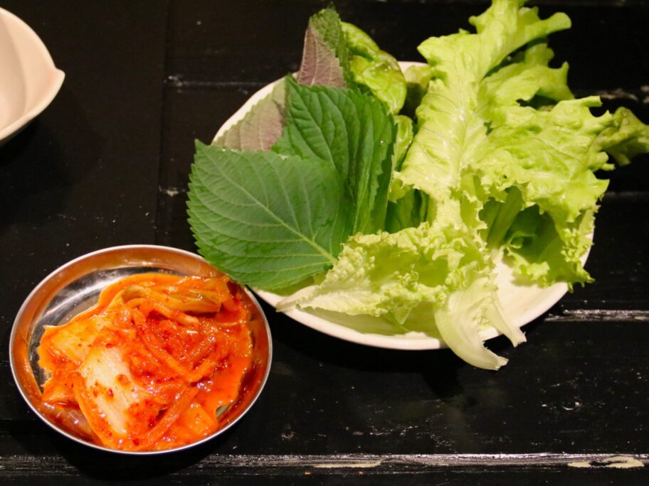 続いては、辛味噌を付けた肉をニンニクとキムチとともにエゴマの葉とサニーレタスで巻いてガブリ。これ、これ。サムギョプサルの醍醐味です。