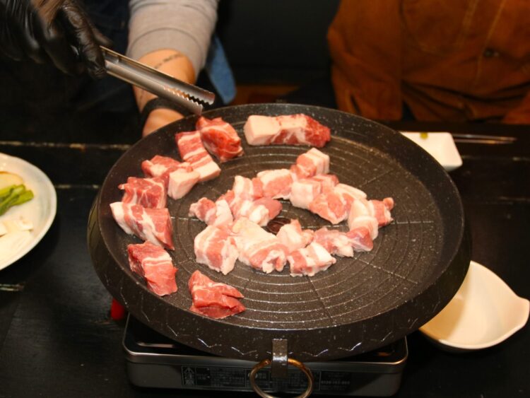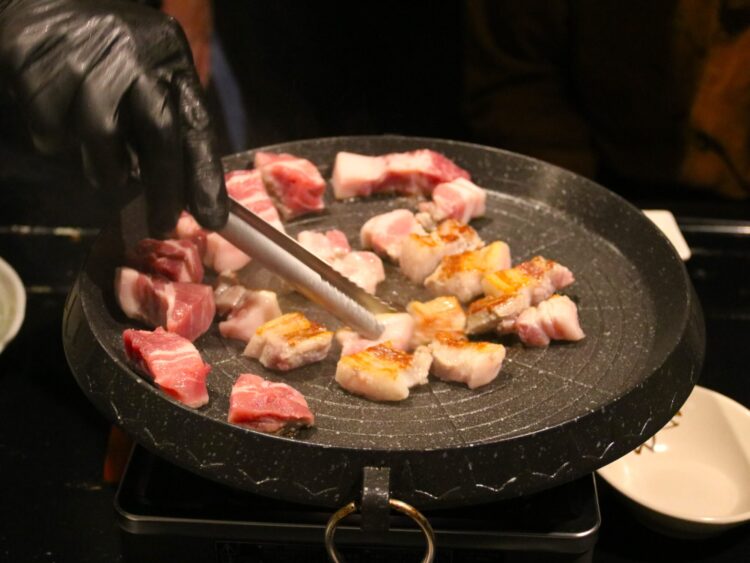 よく見かけるサムギョプサルは厚めにスライスしたバラ肉ですが、こちらは分厚い角切り。バラ肉のほか肩ロースもあり、食べ比べできます。