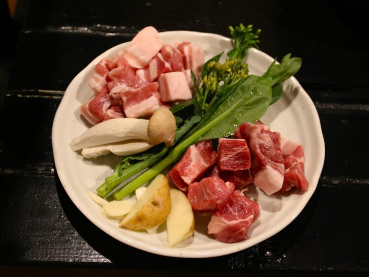鍋の中央に穴が開いていて余分な脂が落ちるので、肉はカリカリ。しっとりした野菜とともに無限に食べ続けられそう。食べ比べの判定はバラの勝ち。脂肉を1番美味しくする料理ですね。