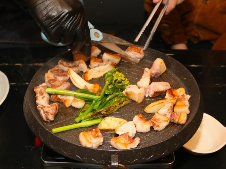 「肉の片面を焦がします。このままお待ちください」。若きオーナー、ジョン・ドゥホさんが熱した鍋に肉を敷き、別の座敷に移りました。ジュージュー、いい音。しばらくして戻ると、肉を裏返し野菜を焼き始めます。両面が焼けたらハサミで一口大に切り、「さあ、どうぞ。最初は韓国の粗塩とワサビで」。