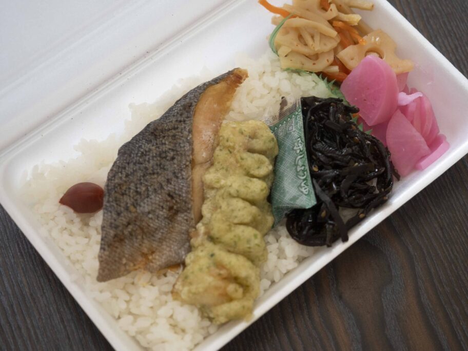 サケ弁はのり弁と並ぶ弁当界の2強でしょう。焼きサケ、チクワの磯部揚げ、昆布の佃煮に梅干しがいいアクセントになっています。サケの皮、いい塩梅です。