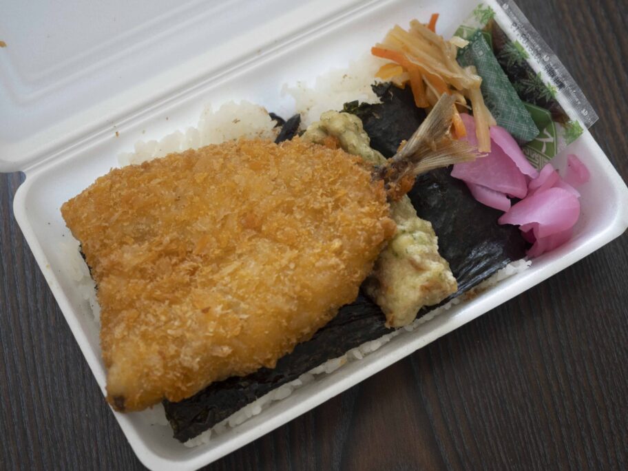 海苔の上にアジフライがどんと乗っています。しっぽを除いて体長15㌢。衣はサクサク、中はふっくら。半身はソース、残る半身は醤油で食べ比べしました。