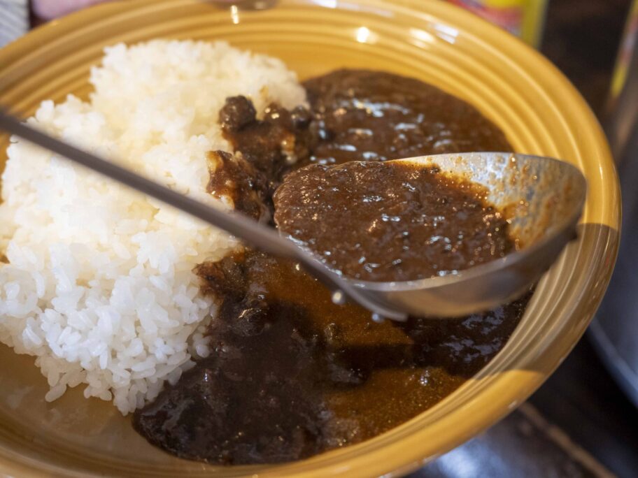 ルーは黒に近い濃い茶色。玉ねぎをしっかり炒めていることが伝わる深い色です。口に入れるとまずコクが広がり、そのあとにほんのりフルーツのような酸味が追いかけてきます。牛と豚の挽肉を使っていて、肉の旨みがルー全体に溶け込みながら、細かな粒感も残る。その加減がいい。美味しくて途中でルーをおかわりしてしまいました。