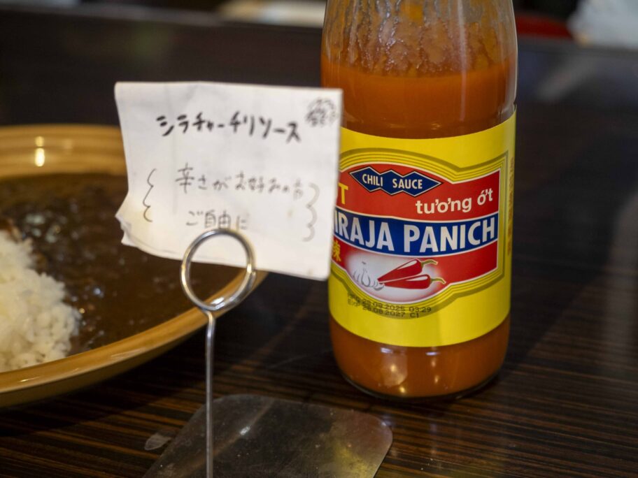 皿を手に取り、ご飯をよそう。隣のジャーから黒いカレーをかけ、シラチャーチリソースをひと回し。さらに100円のベーコントッピングを加える。キングピンカフェの名物「よーだカレー」は自分で一皿を仕上げていく楽しさがあるメニューです。