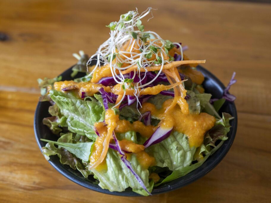 セットのミニサラダも手を抜いていません。ブロッコリースプラウト、ニンジン、紫キャベツ、リーフ類と内容が充実。自家製のにんじんドレッシングがおいしく、さっぱりしながらも味に厚みがあります。カレーの合間に食べると口の中が整い、また次の一口が進みます。