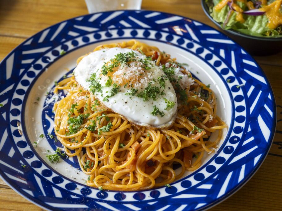 全メニューにドリンクバーが付くのもうれしい。100円のトッピングはベーコンのほかにチーズや目玉焼きなど数種類。次は別の組み合わせも試したくなりました。