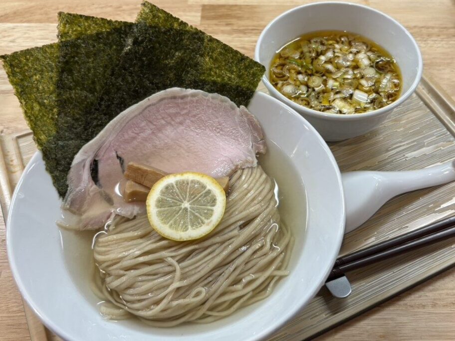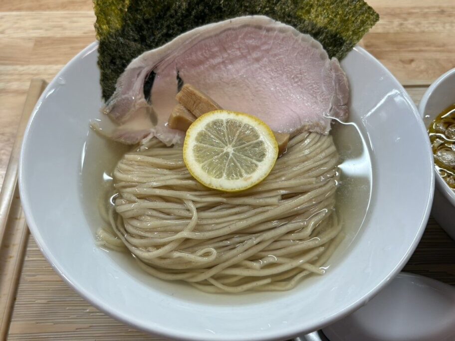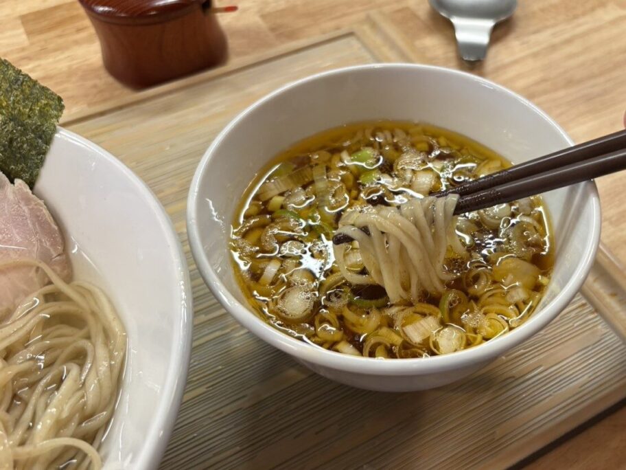 透明なスープは黄金色に輝いています。麺はつけ麺のとは違い、絹のように白い細麺でした。