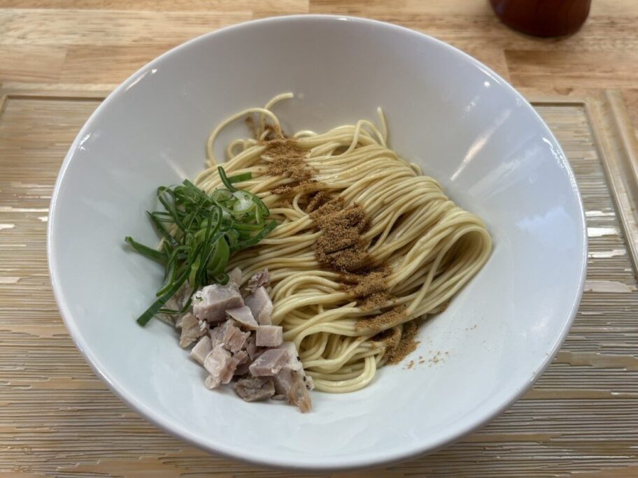 チャーシューや青ネギに魚粉がたっぷりの和え玉をよく混ぜ、そのまま食べたり、スープに浸してつけ麺にしたり。満足そうな顔で完食しました。