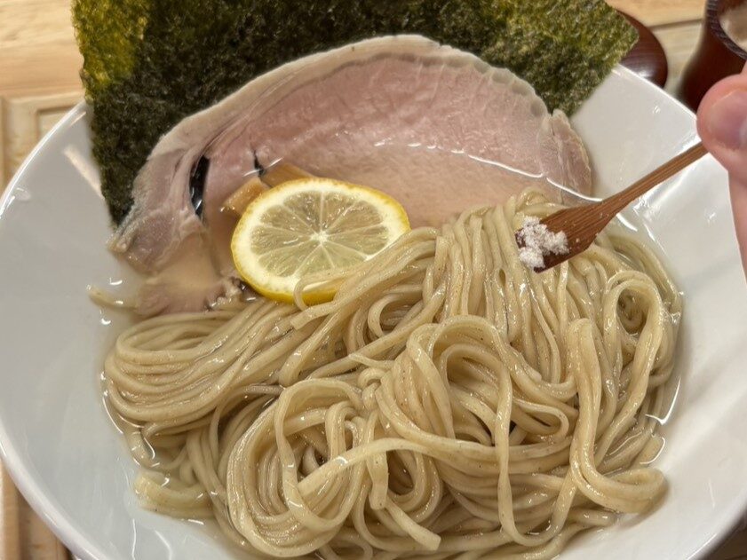 続いて、藻塩を麺にひと振り。旨みが一層引き立ち、小麦と昆布の香りの二重奏を楽しみます。