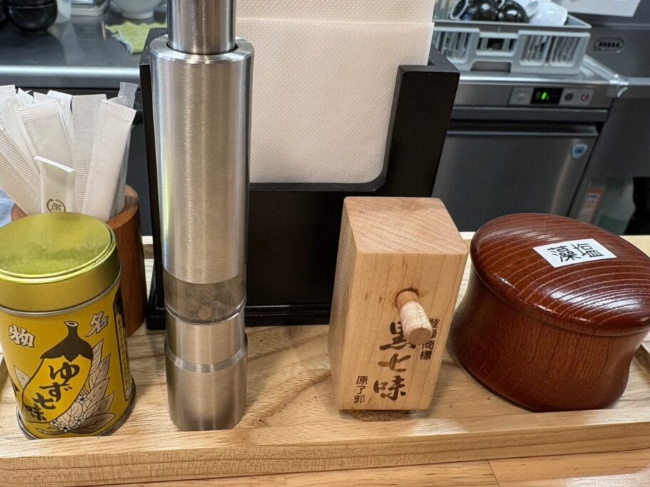 つけ麺の名店によく置いてある黒七味とゆず七味は後半の味変に活躍します。麺に直接かけると、風味の違いをよく感じられます。