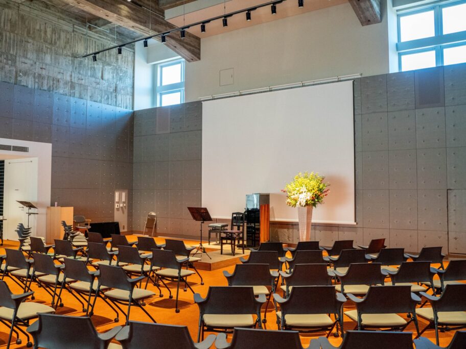 つどにわホールのある、しののめ信用金庫前橋営業部ビルは1964年に完成した旧前橋信用金庫本店を前橋市出身の建築家、宮崎晃吉さんがリノベーションを施し2022年完成した。ホールは3階にあり、2層吹き抜けの開放感ある構造。コンクリートと無垢の杉板が並ぶ荒々しくも美しい内装で、100人収容できる多目的ホールとして使われている。