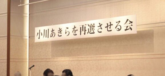 「小川あきらを再選させる会」が主催した支援者集会は出席者が200人の見込みを大きく上回り、急きょ席を100席追加した。報道陣には非公開で開かれた。