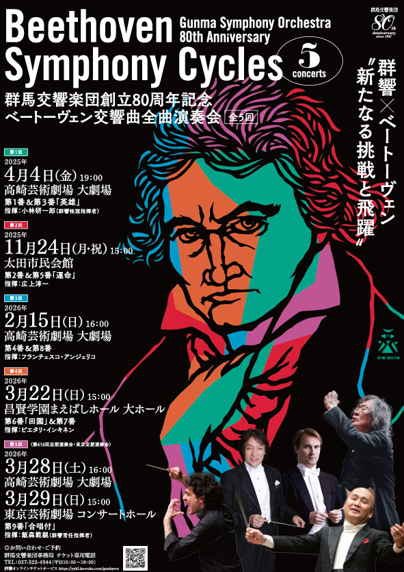 群馬交響楽団創立80周年記念事業として取り組む「ベートーヴェン交響曲全曲演奏会」シリーズの第4回公演が2026年3月22日15時から、昌賢学園まえばしホール(前橋市民文化会館)大ホールで開かれる。曲目は交響曲第6番《田園》と第7番を演奏する。指揮はピエタリ・インキネン氏。チケット発売中。