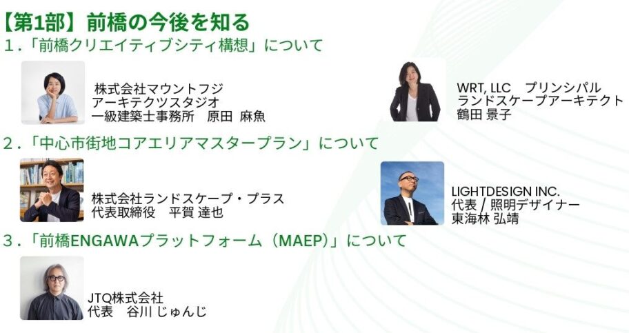 第1部は「前橋の今後を知る」をテーマに、前橋クリエイティブシティ構想、中心市街地の将来像を描いた「中心市街地コアエリアマスタープラン」、市民の声をデジタル空間で可視化する新たな仕組み「前橋ENGAWAプラットフォーム(MAEP)」について、専門家が分かりやすく解説する。