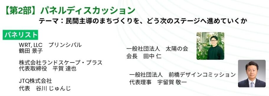 第2部は「民間主導のまちづくりを、どう次のステージへ進めていくか」をテーマにパネルディスカッションを行う。太陽の会の田中仁会長、MDCの宇留賀敬一代表理事が加わり、前橋の将来像や市民参加のあり方、今後の具体的なステップについて、来場者と意見を交わす。
