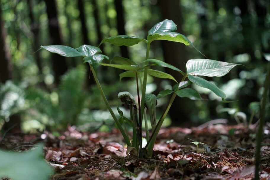 つやつやした大きな葉っぱの下をのぞくと、まるで仮面のような不思議な形の花(正確には”仏炎苞”といいます)が目を引きます。