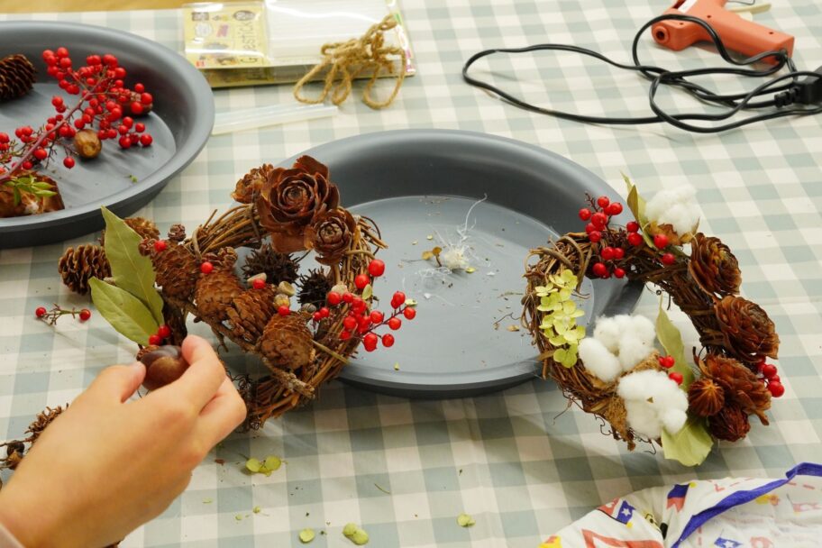 お好きな材料を並べていくと、気づけば自分らしさのつまった、あたたかな冬のリースが完成します。