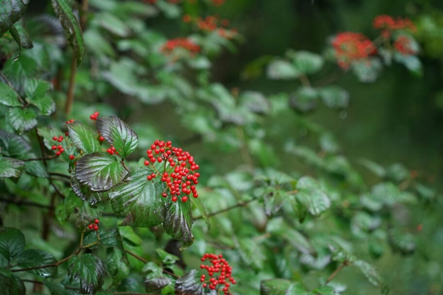 「ガマズミ」はたわわに実る赤い小さな果実が、枝先を彩り、遠くからでも目を引きます。熟すほどに透明感を増し、まるで宝石のようです。鳥たちにとっても大切なごちそうです。