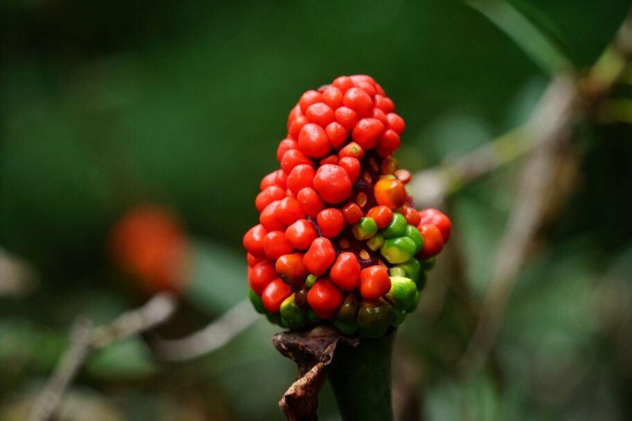 独特の姿で森に存在感を放つのは「マムシグサ」。初夏に特徴的な仏炎苞をつけたあと、秋には実が赤く熟して立ち上がり、森の中で燃える炎のように際立ちます。その印象的な姿は、一度見ると忘れられない秋の風景です。