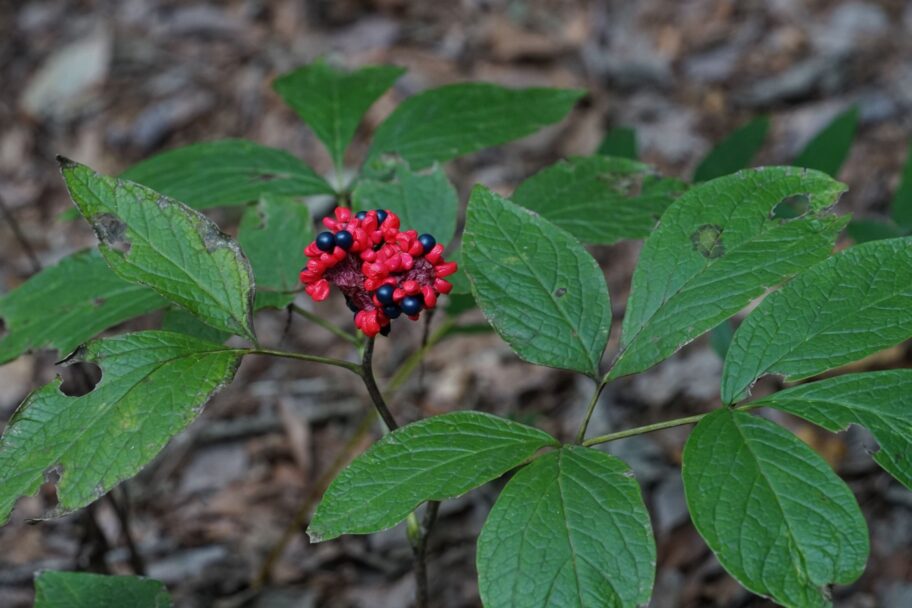 「ヤマシャクヤク」は春には、可憐な白い花を咲かせ、秋には花からは想像し難い、驚きの姿を見せてくれます。黒々とした種子と結実しなかった鮮やかな赤い実が並び、少し不気味かもれません。鳥を呼び寄せるために黒い種子とは別に、目立つ赤い色の実をダミーとしているようです。