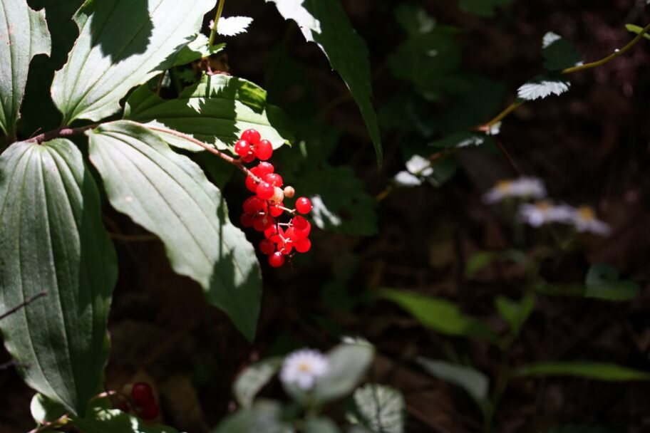 「ユキザサ」は夏に咲いた小さな白い花が姿を変え、光沢のある赤い実となって足元を飾ります。一粒一粒がきらりと光り、小さな宝飾品のように静かに佇んでいます。
