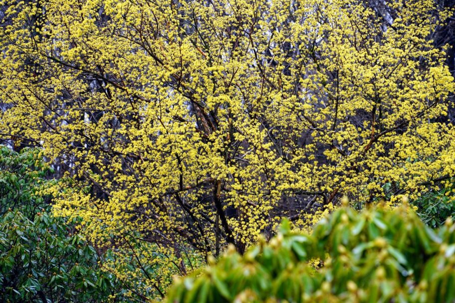 もう少し視線を上げると、小さな小さな花を枝いっぱいにつけたサンシュユ。やわらかな黄色が、青空に映えて、森全体を明るくしてくれます。