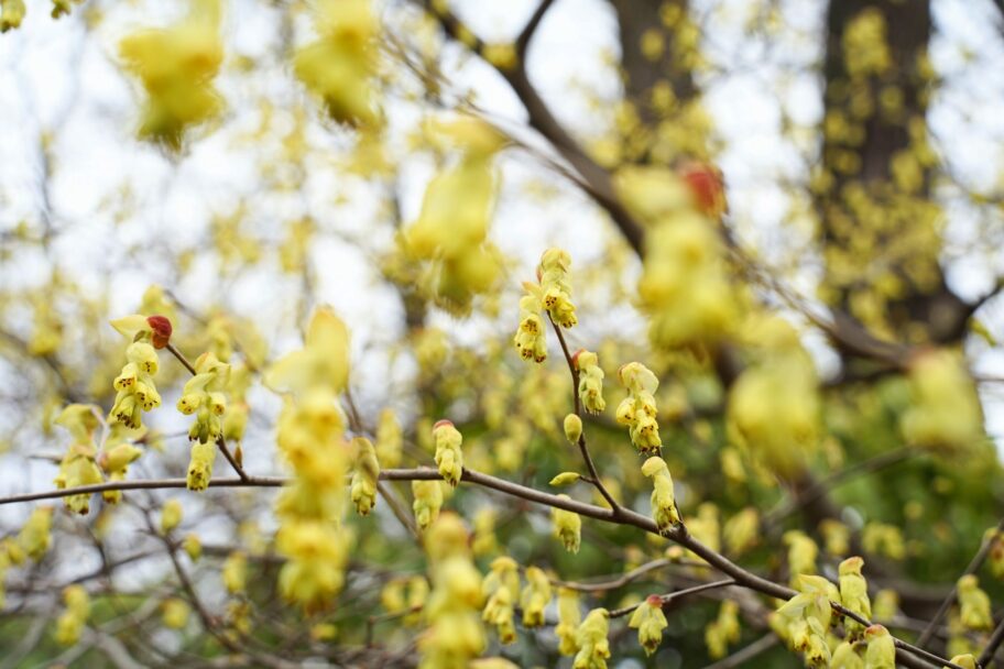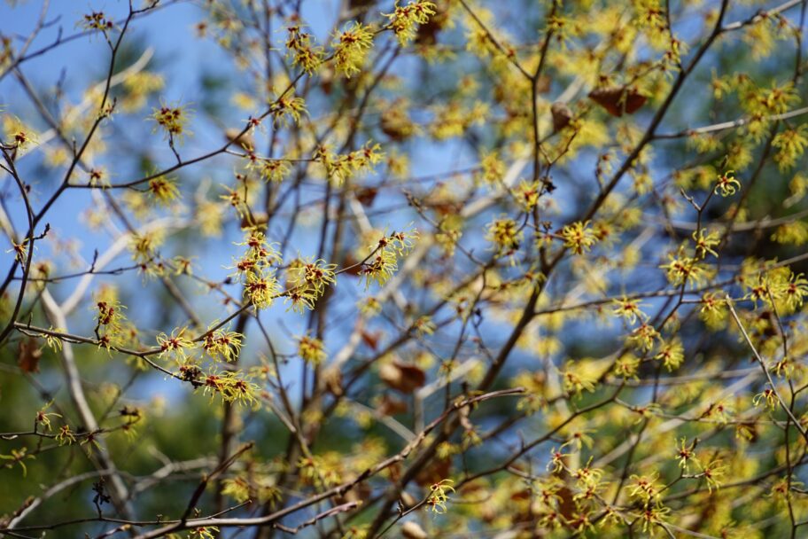 枝先では、糸のような花びらをくるりと広げるマンサクが、まだ冷たい空気の中で春の訪れを知らせます。