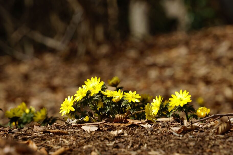 まずは、地面すれすれに太陽を抱くように咲くフクジュソウ。