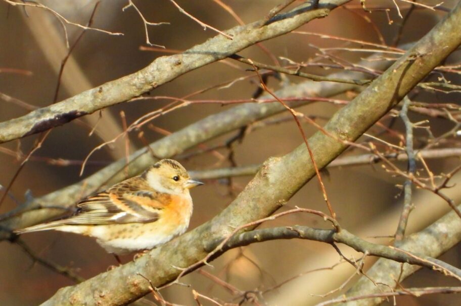 「アトリ」は、冬になるとシベリア方面から大きな群れでやってきます。褐色とオレンジ色が混ざった羽色は、地味すぎず派手すぎず、冬の森で存在感を主張します。