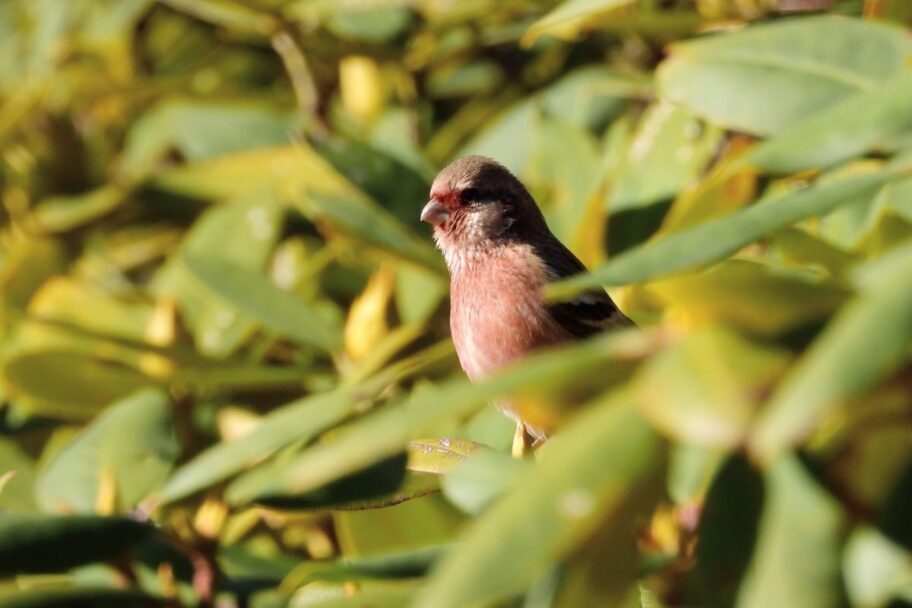 「ベニマシコ」は、名前からその姿を想像しやすいかも⁈ オスの赤みがかった羽色は、ひときわ輝きますが、常緑樹に隠れていることが多く、声が聞こえても姿が見えないこともしばしば。