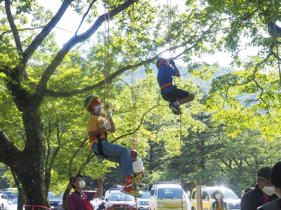赤城山の自然を体いっぱいに感じられる体験も用意されている。ロープの上でバランス感覚を試すスラックライン、専用のロープを使って木に登るツリーイングは、子どもから大人まで夢中になれる人気プログラム。