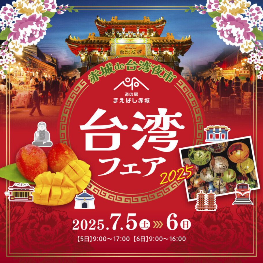 台湾の味と文化を丸ごと体験できる「台湾フェア」が、道の駅まえばし赤城で7月5日、6日に開催される。今年のテーマは「台湾夜市」。本場のグルメやステージパフォーマンス、物産、雑貨販売など、まるで台湾旅行のような2日間を楽しもう。