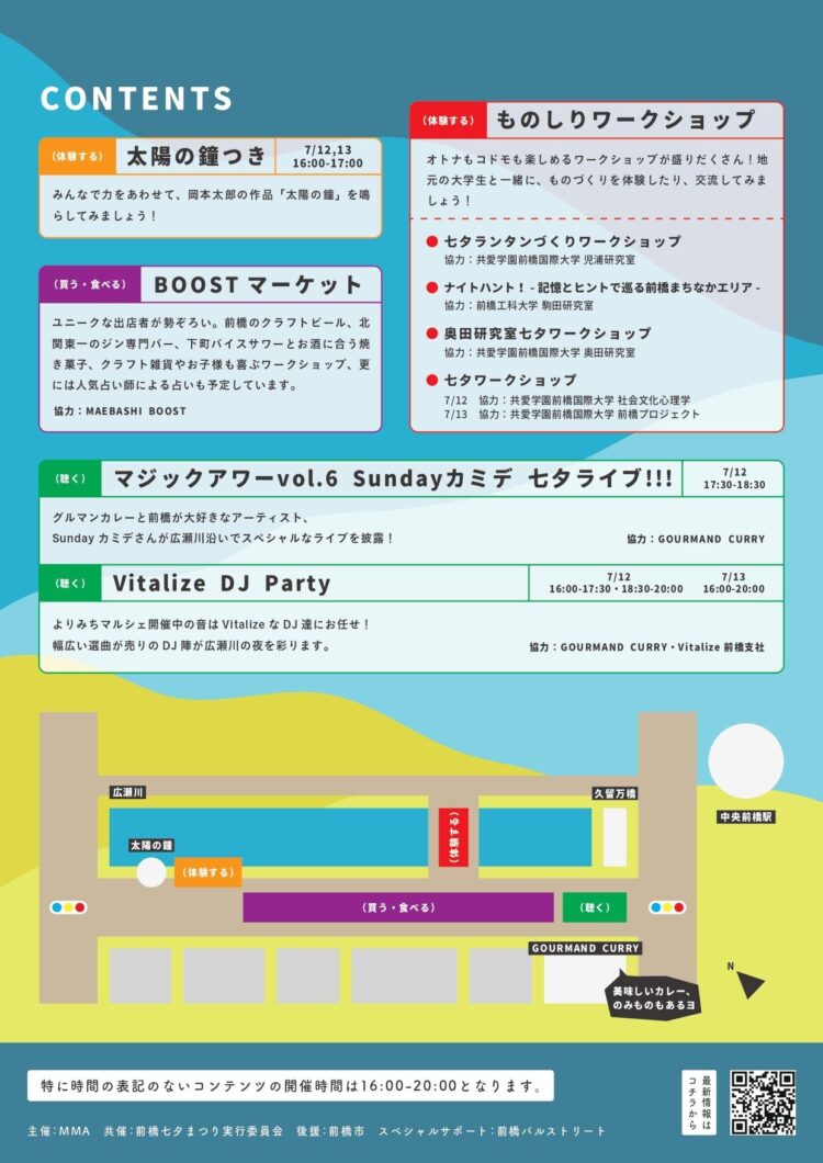 七夕まつりを楽しんだ後、疲れた体を癒しつつ、祭りの“二次会”をしてもらおうと、前橋まちなかエージェンシー(MMA)が昨年に続いて企画した。会場は広瀬川河畔緑地の太陽の鐘から久留万橋までの区間。暑さが和らぐ16時から始まる。