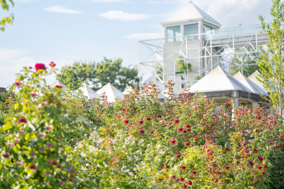 注目は園オリジナルの黄色いバラ「ココンジョーヌ」。ティーのやさしい香りが漂い、中央に立つと芳香に包まれる特別な体験ができる。園のシンボル・ツインタワーは緑に覆われていく過程を楽しめ、展望スペースからは前橋市街地まで一望できる。