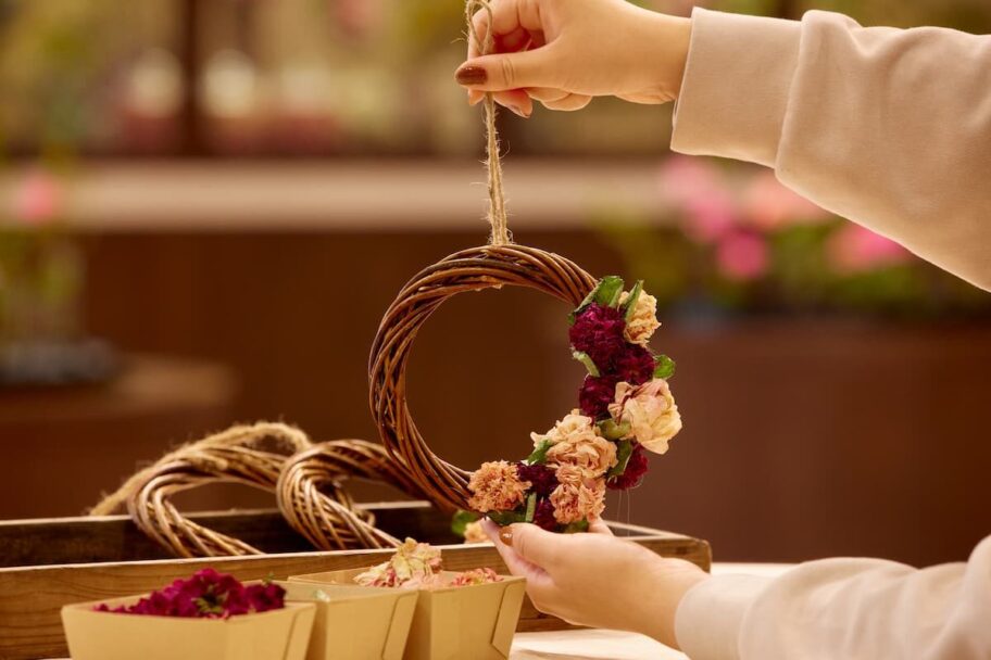 秋の見ごろを迎える「草花や秋バラの花摘み体験」は、訪れる人に人気のプログラム。自分の手で摘み取った花を専用ボトルに入れて持ち帰れるとあって、家庭に彩りと香りを添えられる。「秋バラのドライリース」や、園内の枝を削って仕上げる「鉛筆づくり」もあり、自然を素材に世界に一つだけの作品を作れる。