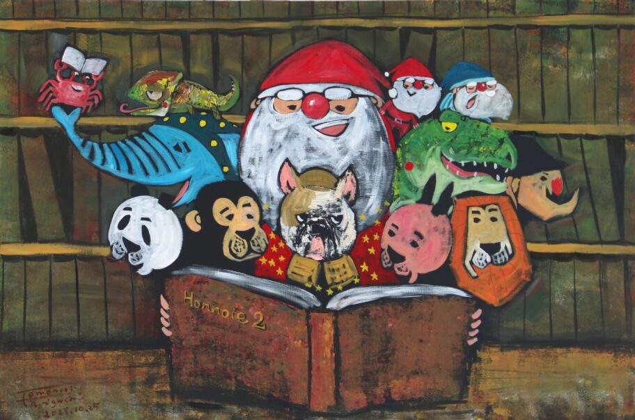 「サンタみたいな存在になりたいとサンタを描いていたら自分に似てきました。世界中の子供たちに優しい絵を届けたい」と谷口さん。12年ぶりとなる代表作『100にんのサンタクロース』の続編『100にんのサンタクロースの12かげつ』が12年ぶりに出版されたのを祝い、朗読隊はミュージカルを披露した。