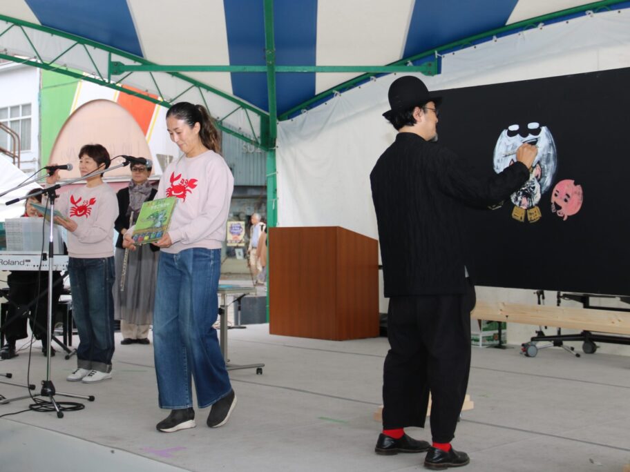 黒い衣装、黒い帽子をまとった谷口智則さんが中央イベント広場のステージに登場すると、親子連れの視線が一斉に集まった。黒いキャンバスに絵筆を走らせ、最初に描いたのはブルドック。サルやパンダ、怪獣やライオンが次々と登場する。