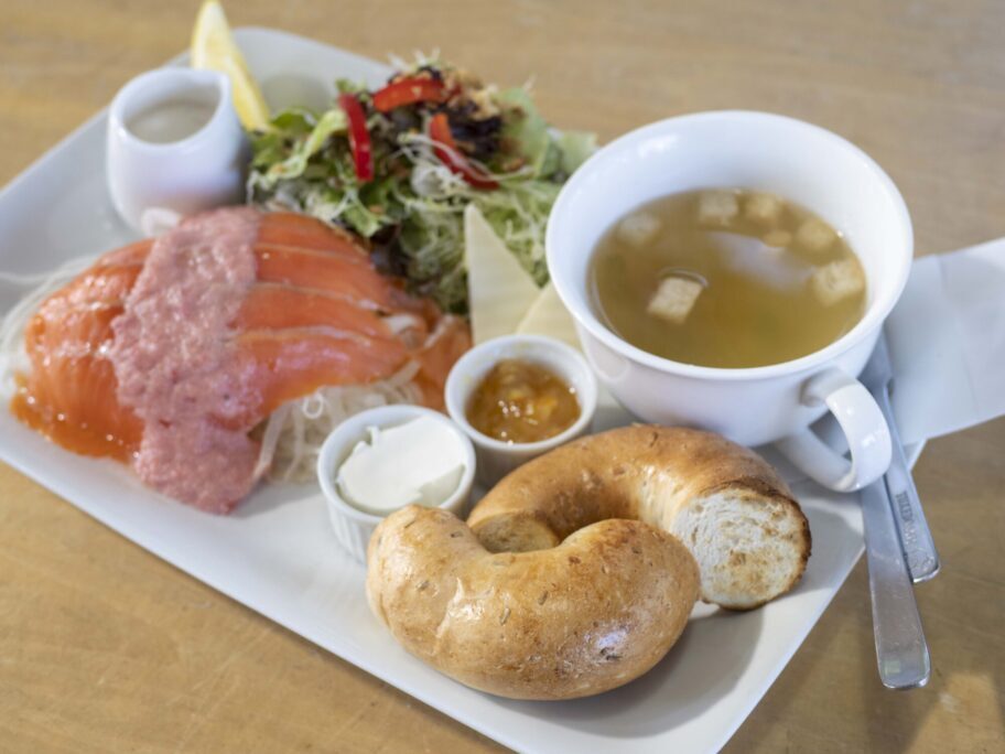 森に囲まれた「モッティーべーグル」。入口には約20種類の手作りベーグルが並んでいます。木漏れ日が差し込むイートインは、パンと自然の間から境目がなくなります。スープとサラダつきのベーグルセットでひと休み。