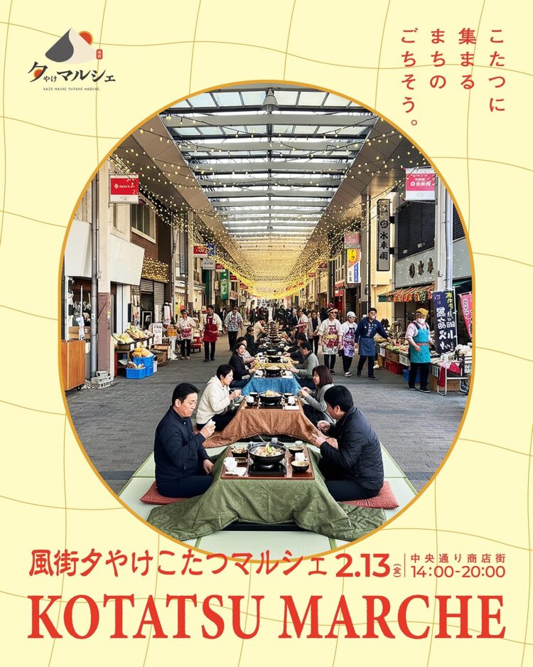 主催する前橋中心商店街協同組合風街夕やけマルシェ実行委員会は「寒い冬だからこそ、外でこたつに入る非日常を楽しんでほしい。中央通りならではの温かな時間を届けたい」と来場を呼び掛けている。
