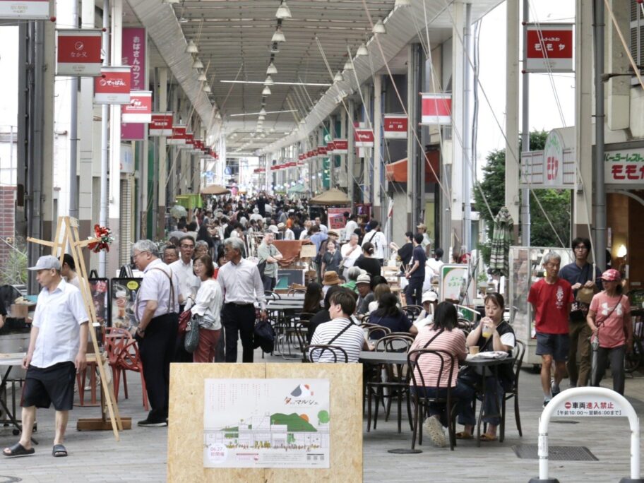 風街夕やけマルシェは中心街で人通りが少なくなる平日夜を食と交流でにぎやかに変える催し。2025年6月の中央通りでのお披露目を経て、金曜の夕方から夜にかけて馬場川通りや弁天通りなどで開かれている。