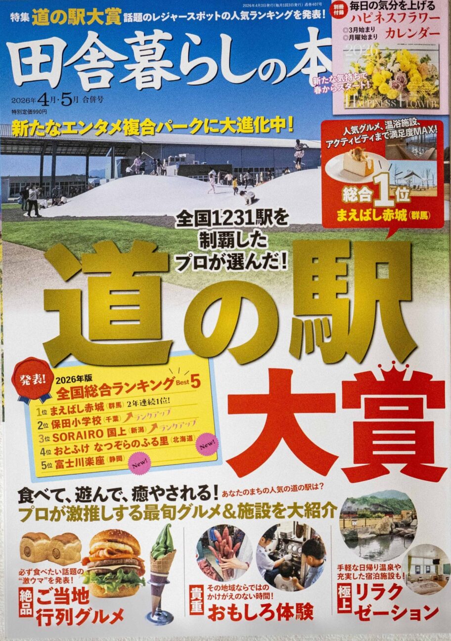 全国1231カ所の頂点に、前橋の道の駅が再び立った。宝島社発行の『田舎暮らしの本』が選ぶ「2026年版全国総合道の駅大賞」で、道の駅まえばし赤城が全国1位に選ばれた。昨年に続く連覇で、巻頭特集の冒頭2ページでも紹介されている。施設の充実ぶりに加え、地元食材、温浴、買い物、食事を一度に楽しめる総合力が高く評価された。