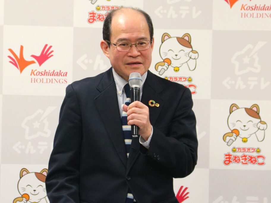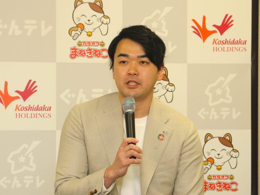 まねきねこを運営するコシダカHDの腰高理志執行役員・室長は「群馬県はコシダカにとって特別の地。祖父、父、私と3代続いて支えていただいた。この思いが今回のプロジェクトの原点」と企画の動機を説明。「郷土愛を育み、歌うことで健康寿命を延ばしていただきたい」と参加を呼び掛けた。
