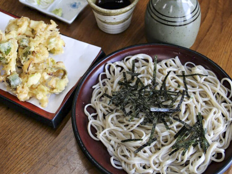 農家の手仕事を感じるのが「三度本店」。1974年創業。コの字カウンターの奥で、店主、樋口文男さんが蕎麦を茹で、冷水で締め、手際よく盛り付ける。やや色黒の平打ちでコシが強い。大ぶりのネギかき揚げを汁に浸し、蕎麦とともに啜ると、素朴で力強い味が口いっぱいに広がる。