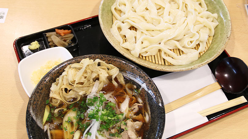 「榛名十文字うどん花木流通センター店」は肉汁うどんの代表格。自家養豚、自家加工の豚肉が山盛りで、まずは肉の旨さに驚く。