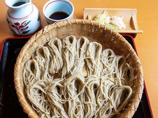 まずは「そば処 孫平治」。温かい種物はなく、もり蕎麦のみ。七合や一升といった単位で頼むと、大きなざるに盛られてくる。家族や仲間とワイワイ啜るスタイルだ。一人前のもりもある。