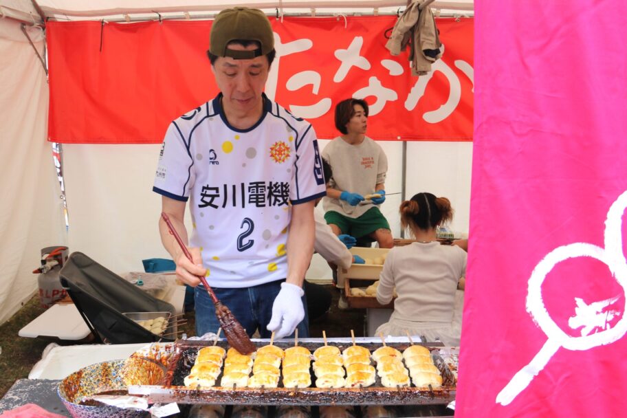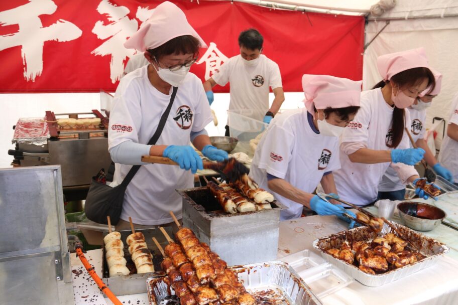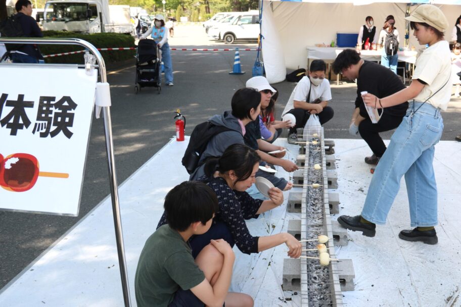 自分で炭火で焼き、好みのタレを付けて味わう体験コーナーも人気を集めた。太田女子高校生がボランティアで協力、海苔チーズ、焼肉のタレ、チョコホイップなど自分たちで考案したタレを薦めた。