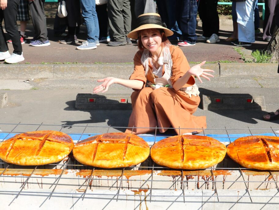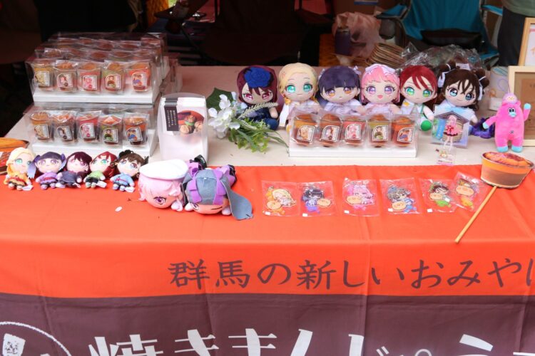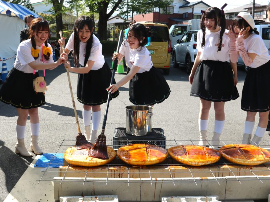 1個が直径50㌢、3㌔の巨大焼きまんじゅうを作るコーナーには、ミニライブを終えたテレビアニメ「前橋ウィッチーズ」の声優5人でつくるアイドルユニット「前橋ウィッチーズ」がタレ付けに挑戦した。