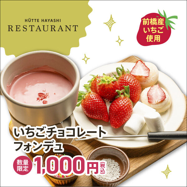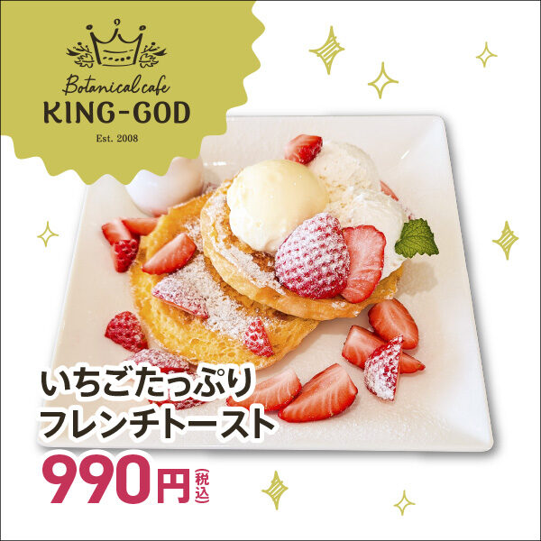 ボタニカル カフェ キング ゴッドはボリューム感のある「いちごたっぷりフレンチトースト」。ヒュッテハヤシレストランは甘いもの好きが飛びつきそうな「いちごチョコレートフォンデュ」を提供する。