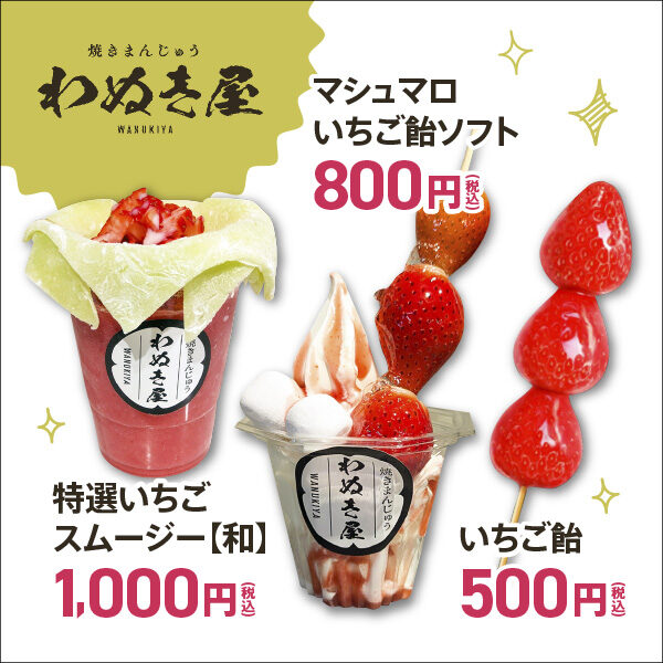 手軽に食べたい人はわぬき屋の「特選いちごスムージー【和】」やいちご飴、パンのオハナの「いちごのミルキーサンド」がおすすめ。